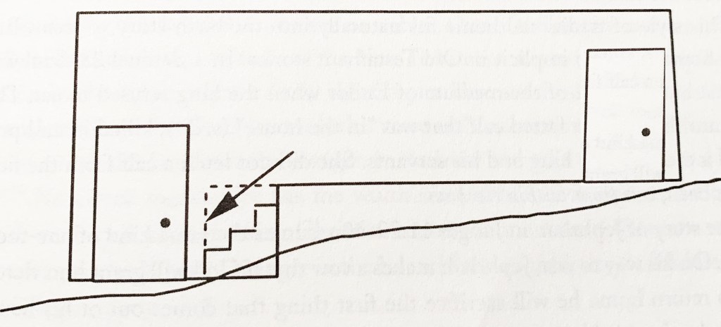 “The door on the lower level serves as an entrance for the people and animals.” (Jesus Through Middle Eastern Eyes: Cultural Studies in the Gospels.” by, Kenneth E. Bailey pg.29). The people would go up the stairs to the “Family Room” and the animals would stay down by the door. Here is the same village house but illustrated above looking down.